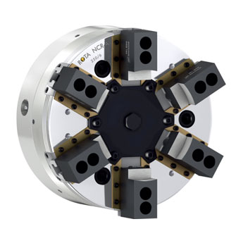 雄克ROTA NCR-A 带有一个中心卡盘活塞,其内部有三个相互间隔 120° 的摆动体。ROTA NCR-A每个摆动体均连接两个基爪。这样保证在六个触点之间工件定心,这些触点可成对调整。由于夹紧力方向朝向卡盘中心,因此实现了定心性能,无需再调整工件尺寸。